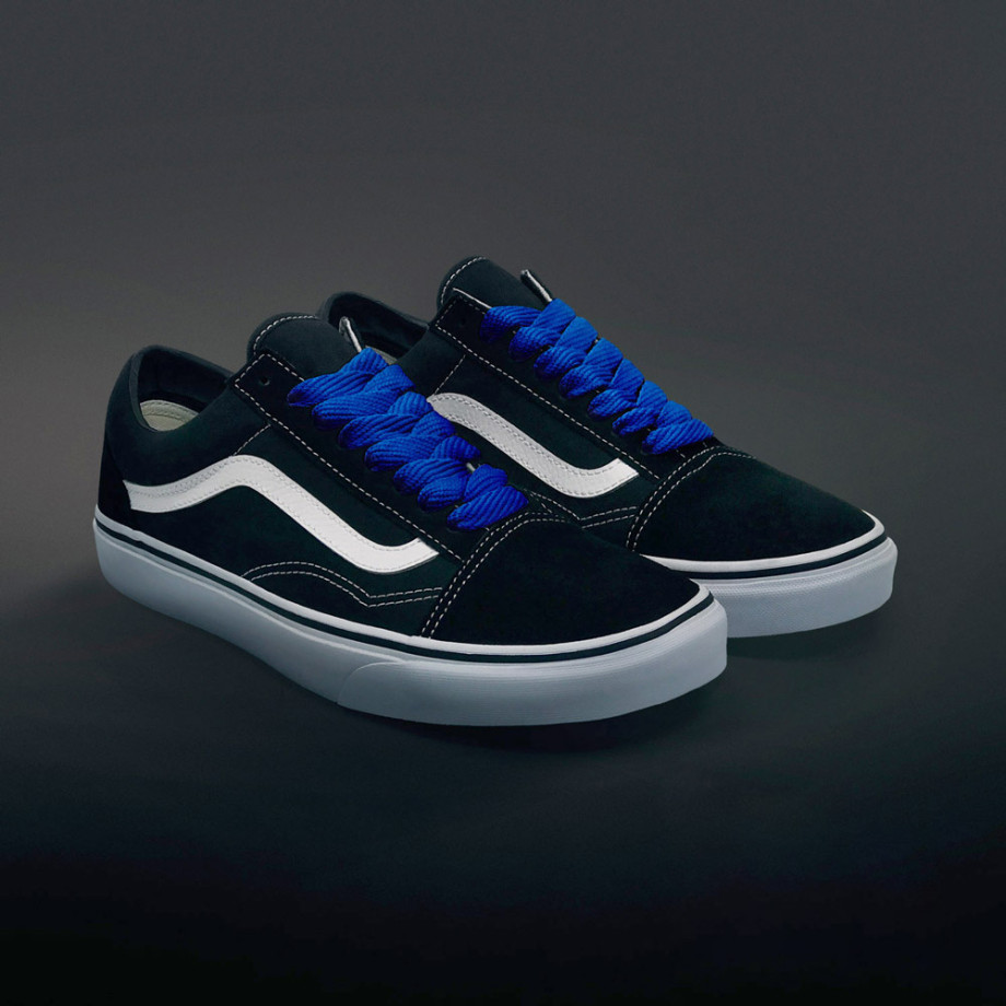Extrabreite blaue Schnürsenkel nehmen eine klassische Grundfarbe und verwandeln sie in ein fetziges Fußmodeaccessoir für deine Sneaker. So wird eine Standardfarbe einzigartig. Wenn das nicht Schuh-Innovation ist, was sonst?